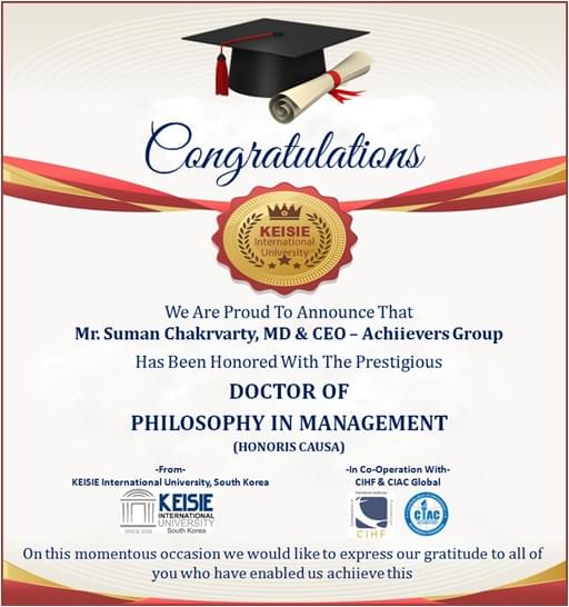We Are Proud To Announce That Mr. Suman Chakrvarty, MD & CEO – Achiievers Group Has Been Honored With The Prestigious DOCTOR OF PHILOSOPHY IN MANAGEMENT (HONORIS CAUSA), from KEISIE International University, South Korea & in Co-Operation With CIHF